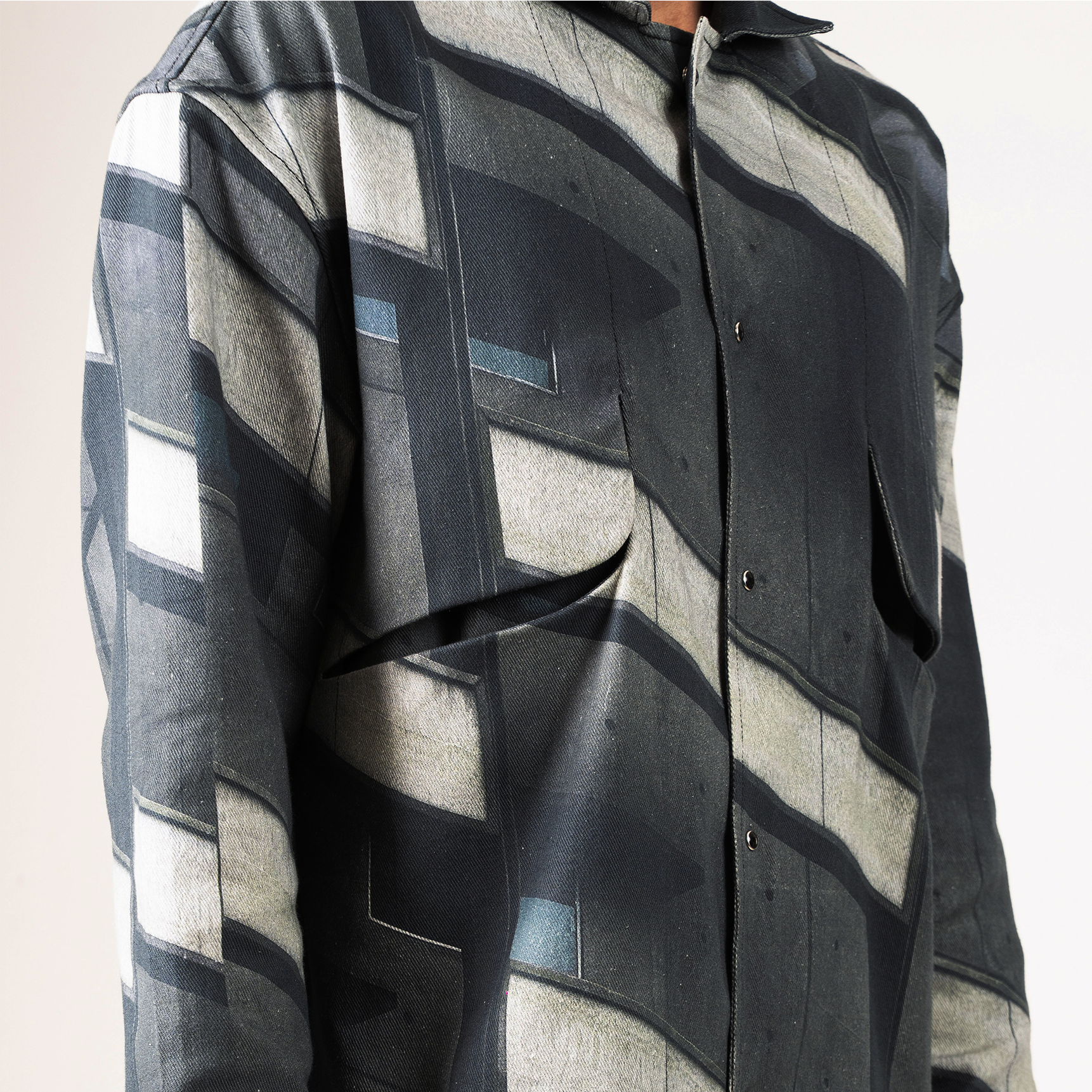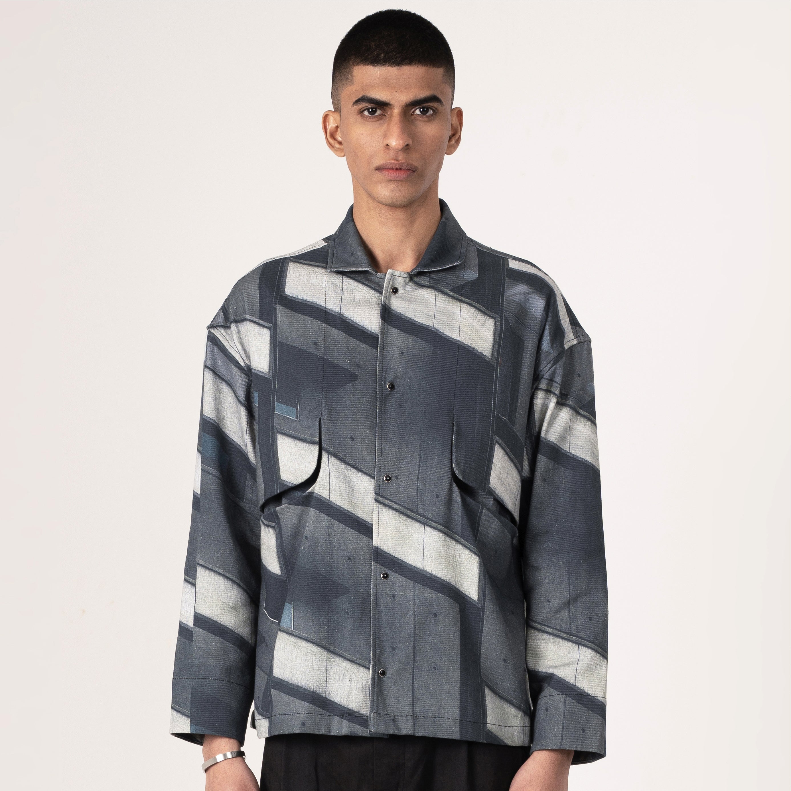 This premium shacket reimagines deconstructed architecture in grayscale geometric panels with blue accents, embodying raw structure, confident disruption, and the poised edge you seek.