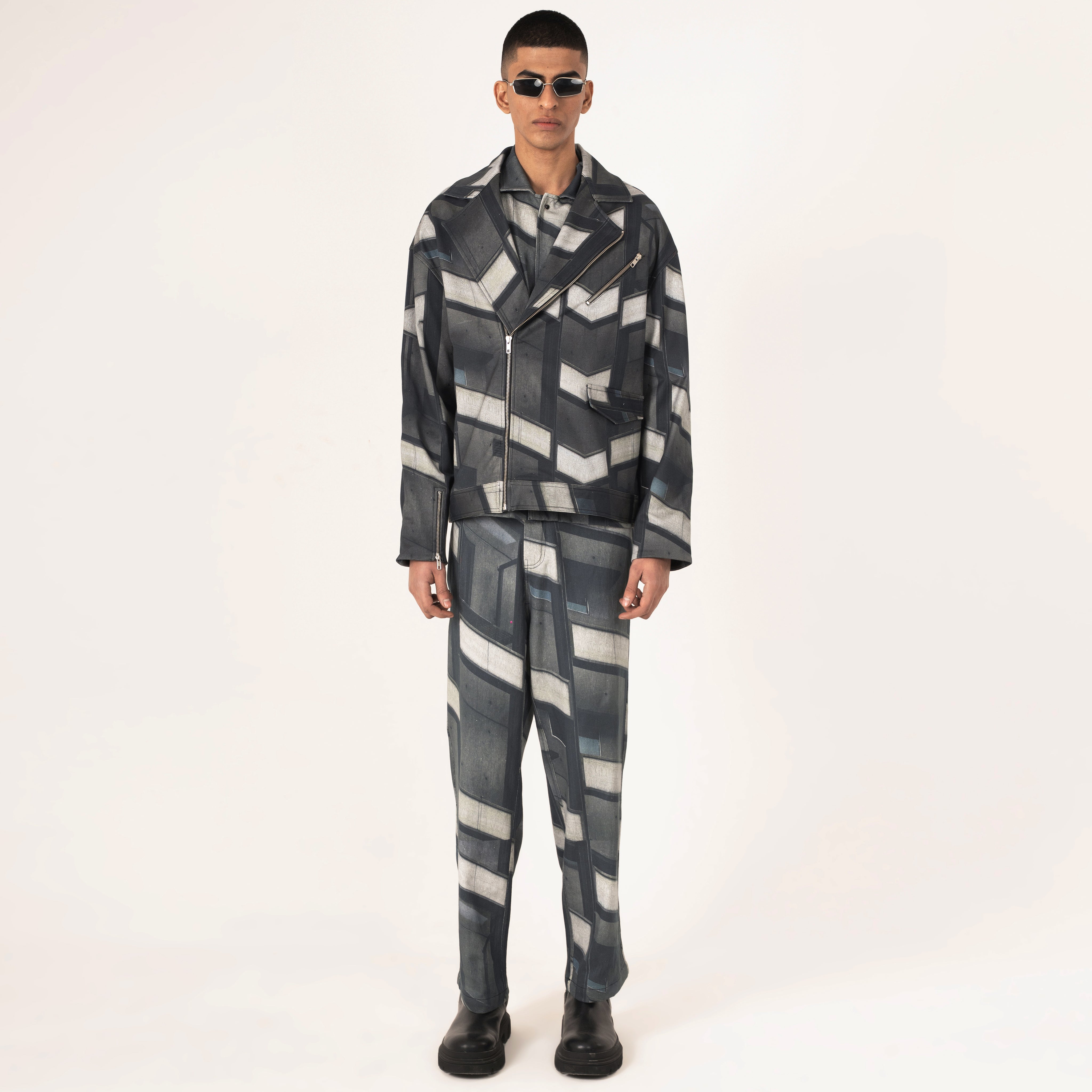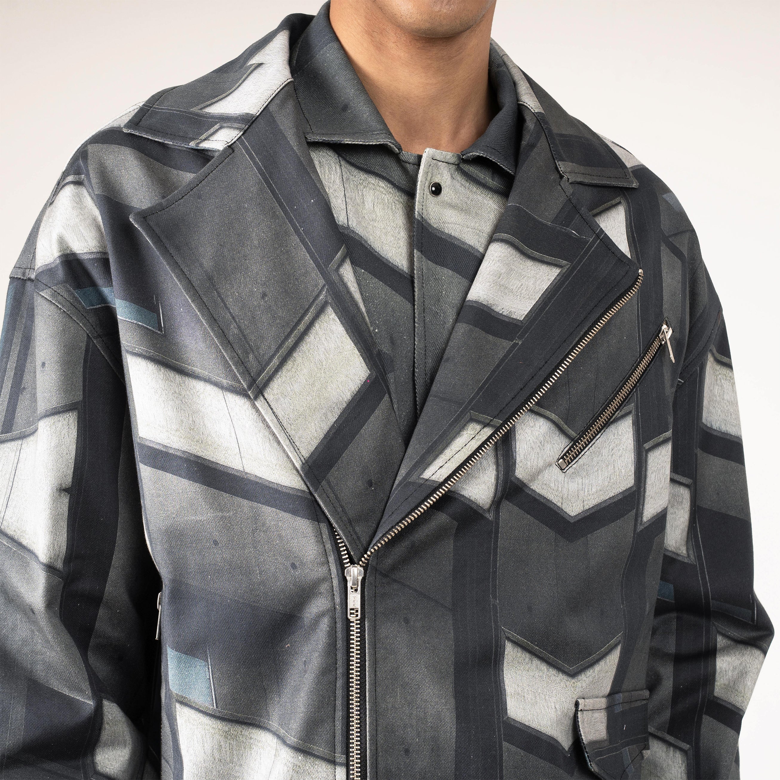 This premium jacket fuses jagged grayscale chevron patterns with subtle blue highlights on a zip-front silhouette, radiating urban deconstruction, bold composure, and the commanding presence you command.