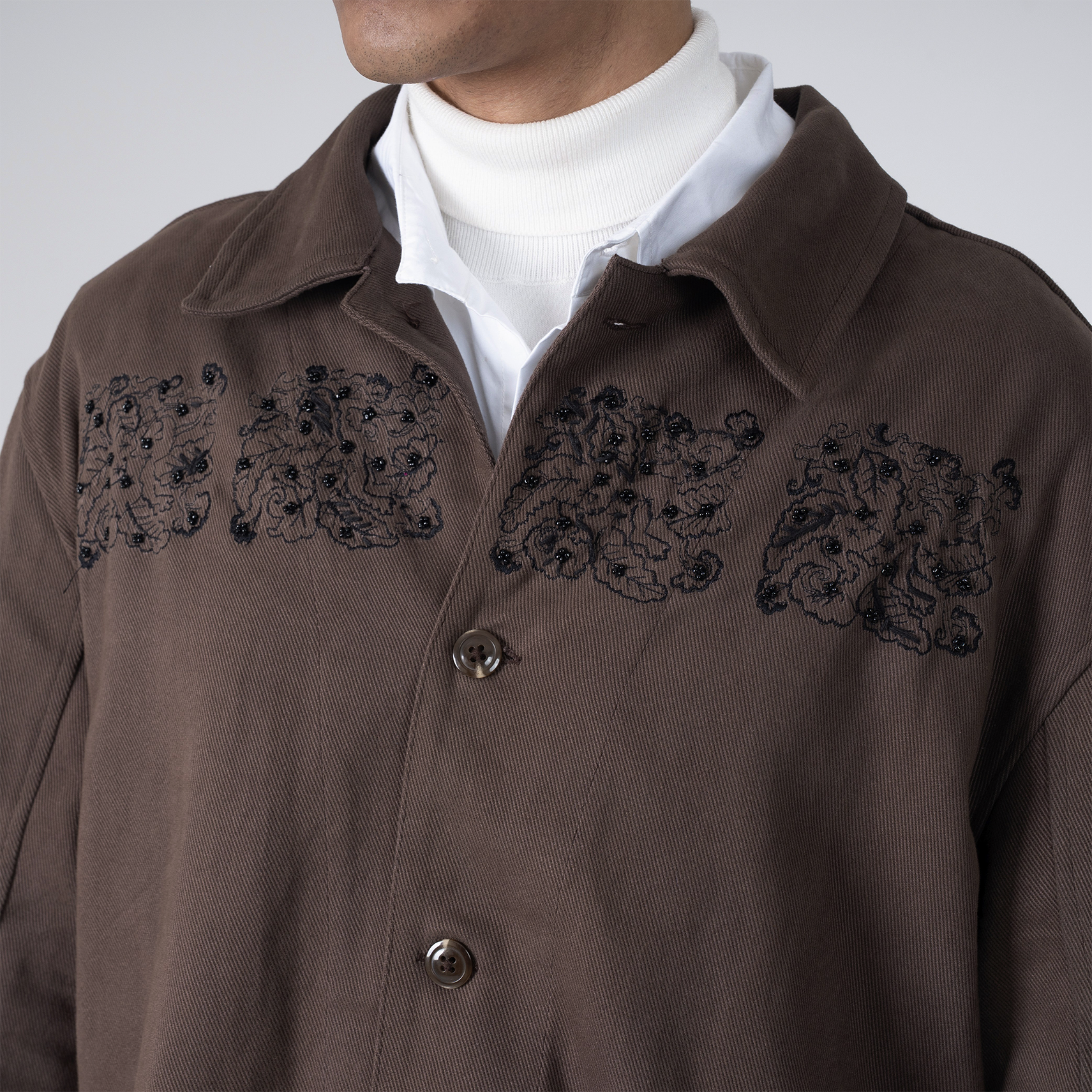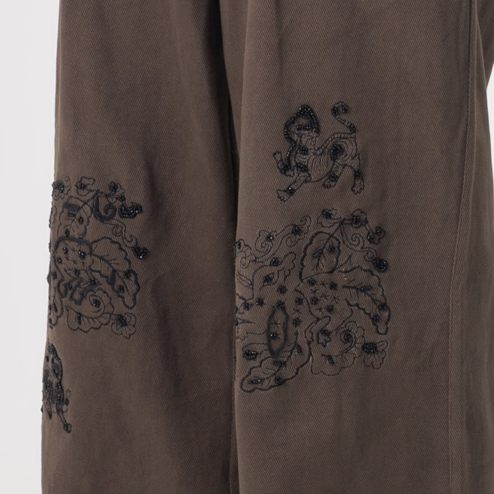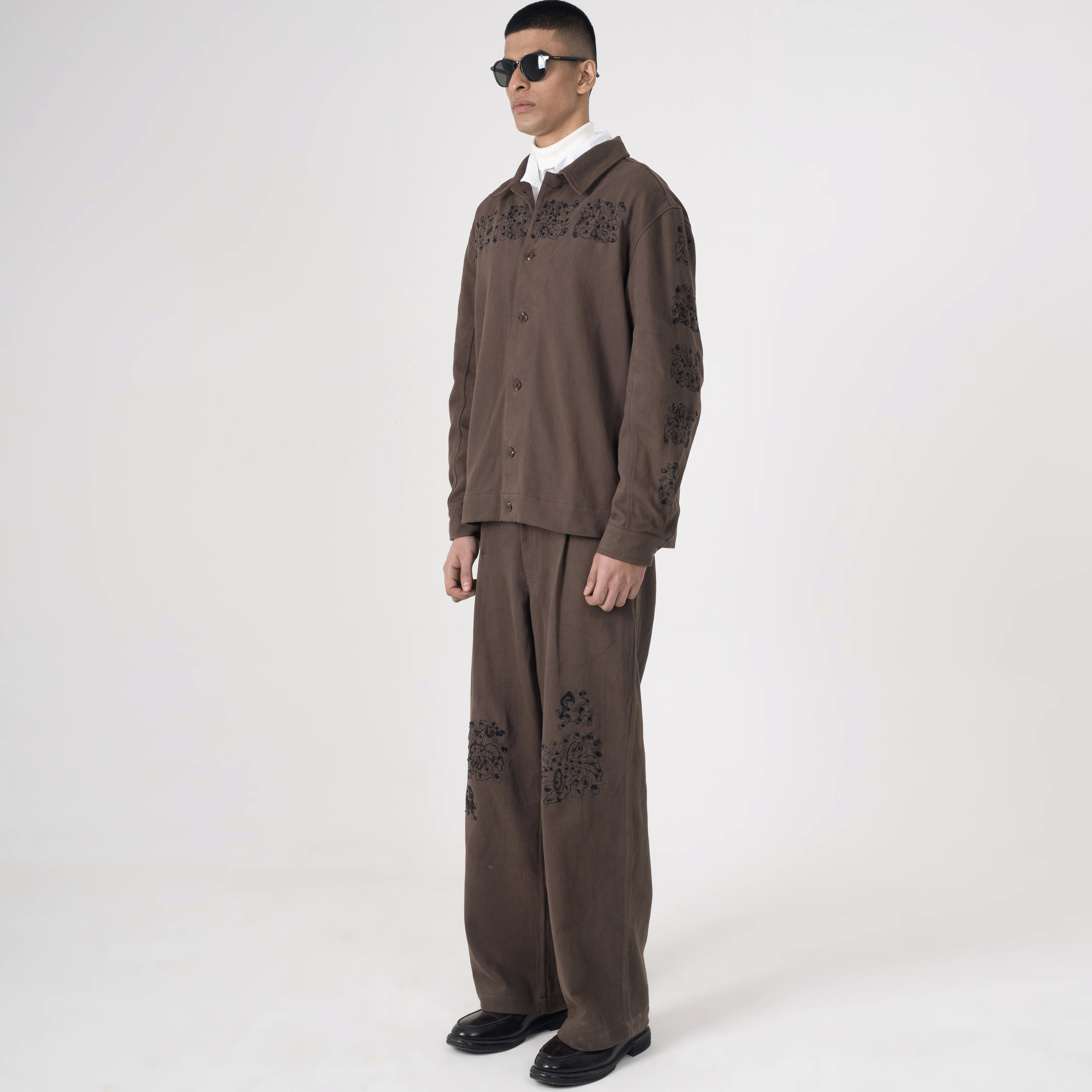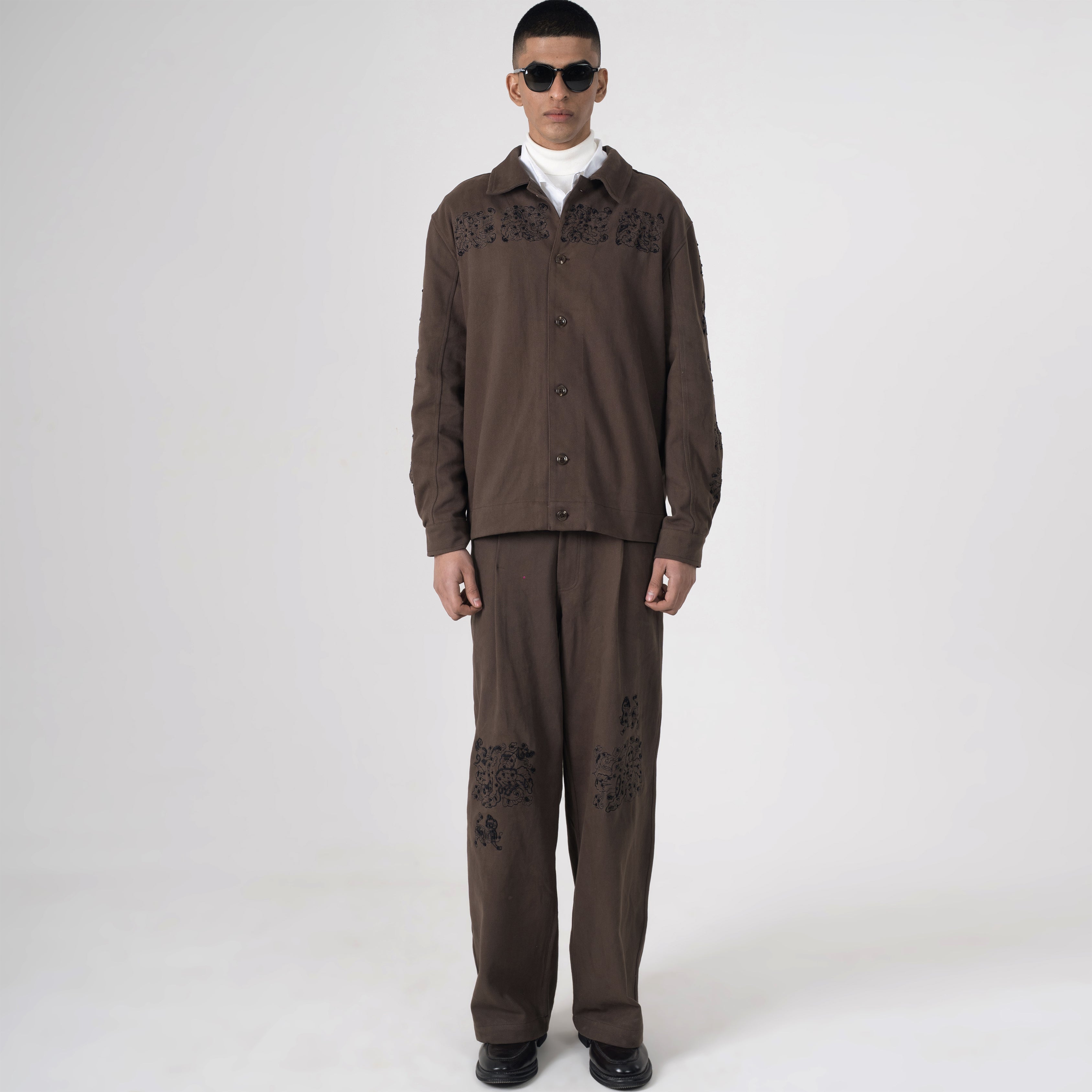 This premium cordset layers rich brown corduroy jacket and matching wide-leg pants with symmetrical black floral embroidery, evoking heritage artistry, grounded confidence, and the timeless poise you embody.