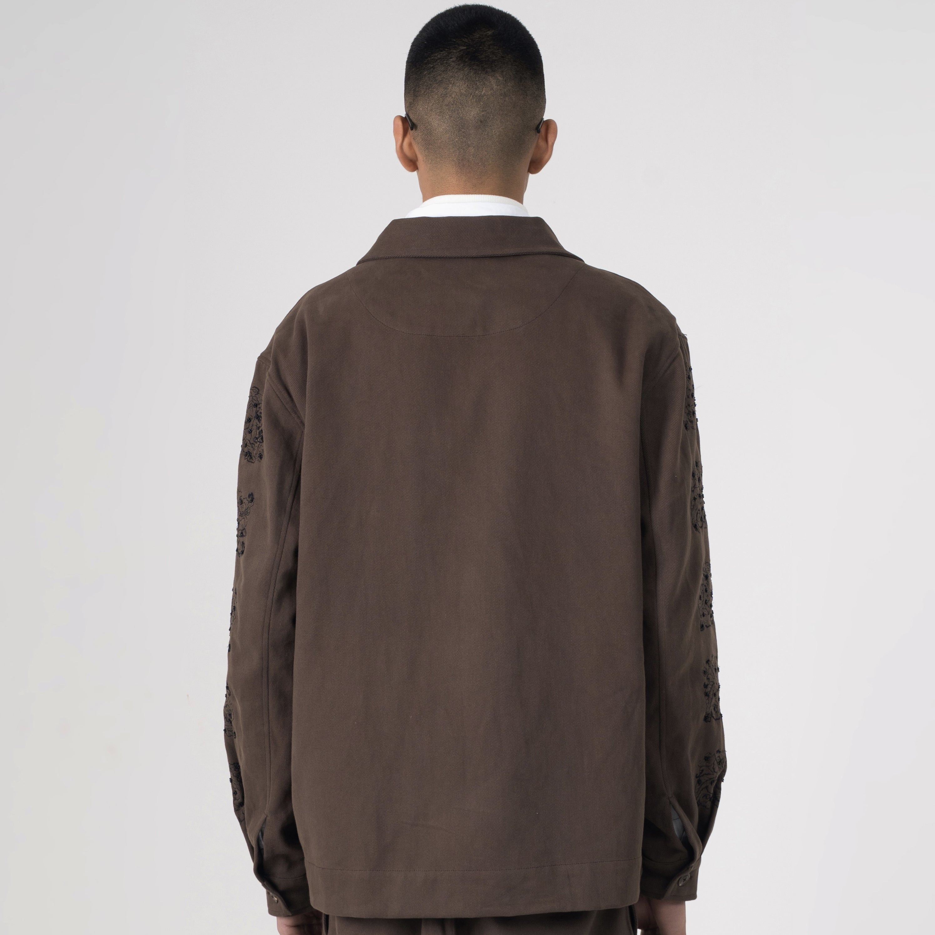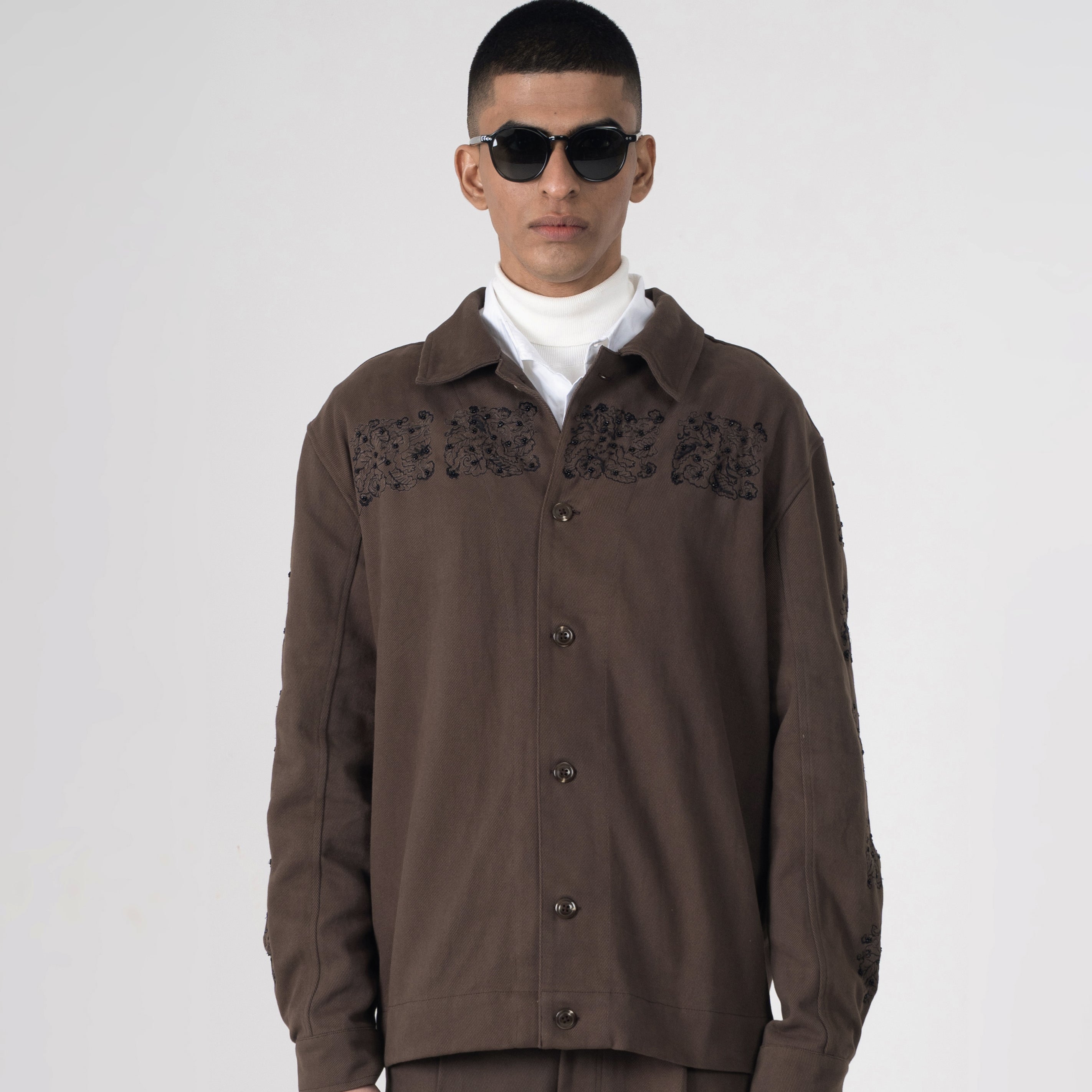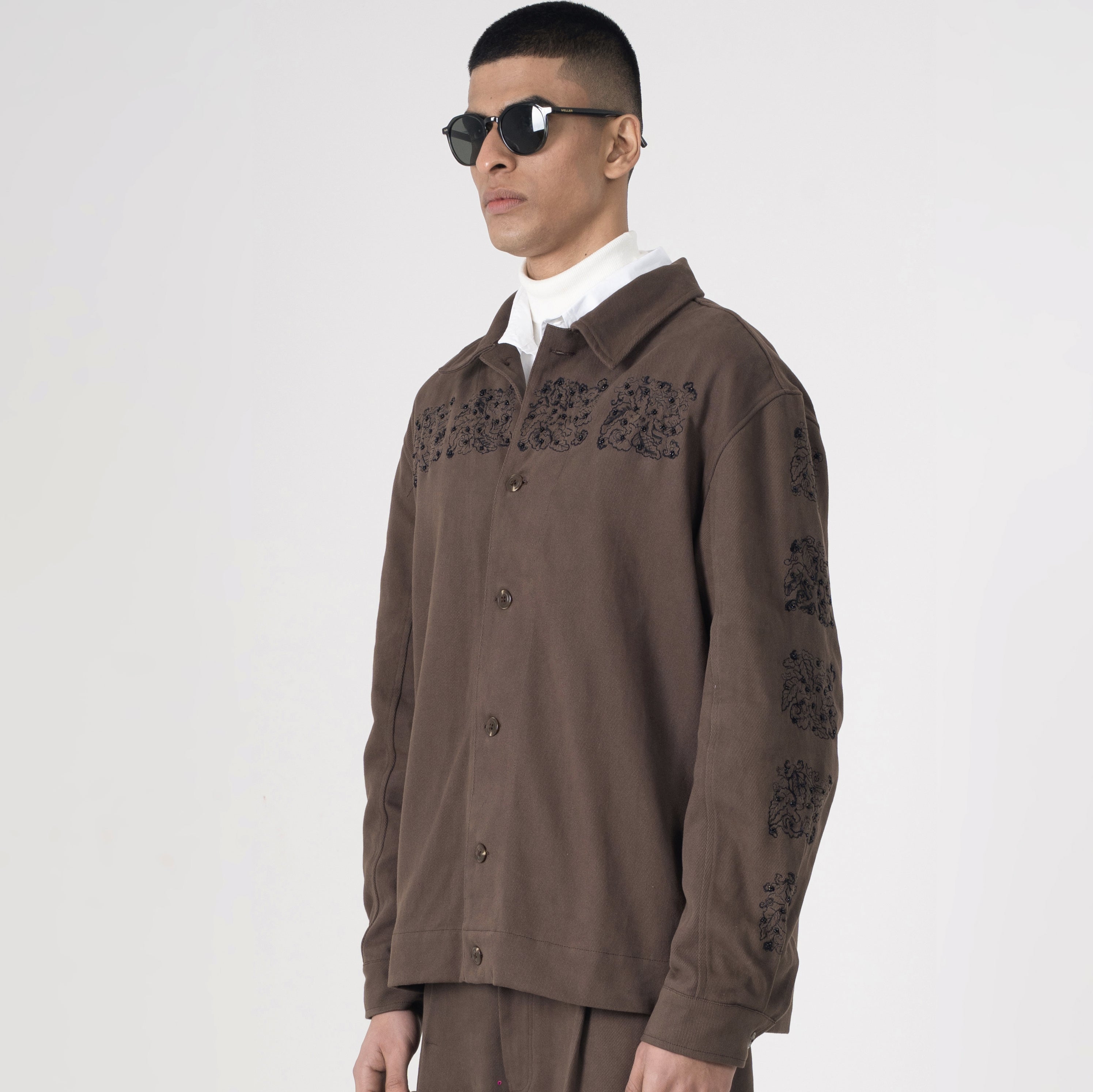 This premium shacket redefines urban utility in deep chocolate brown canvas with striking black AURGE embroidery cascading across the chest, capturing textured resilience, poised disruption, and the effortless command you own.